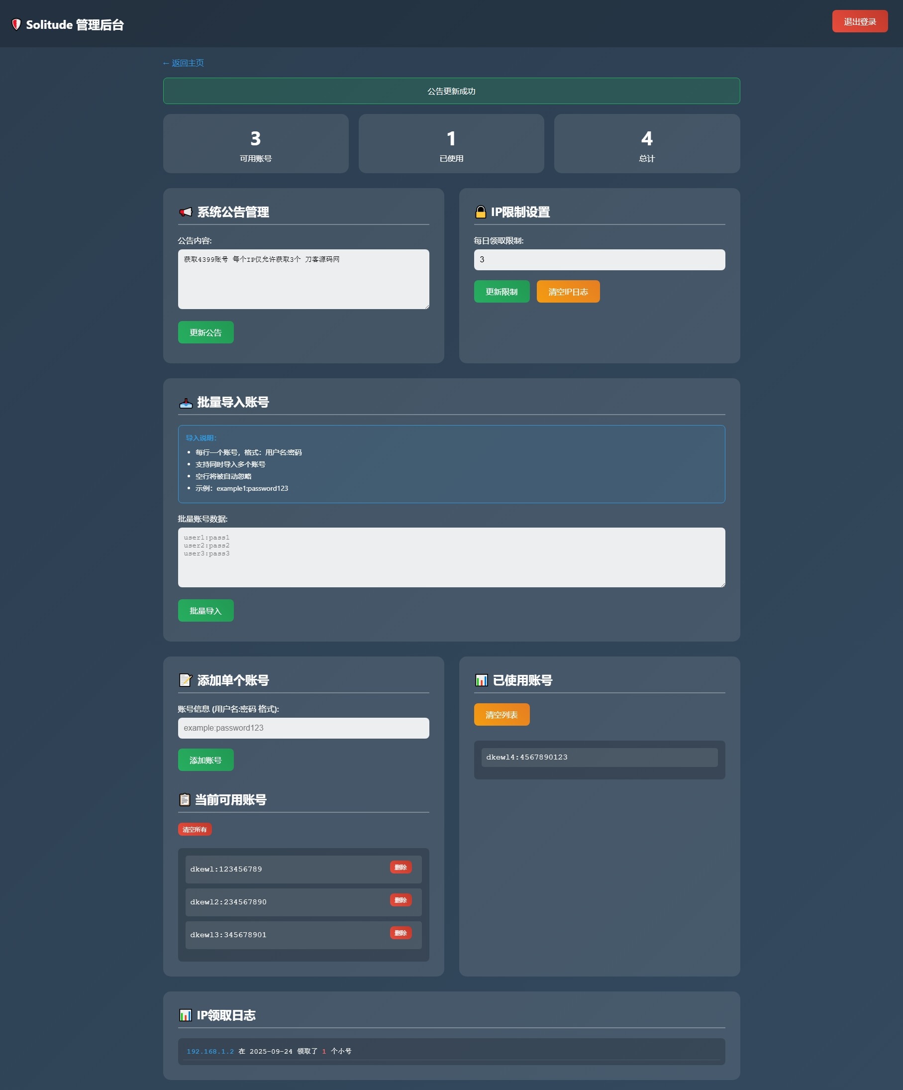 小号分发 卡密分发系统网站源码 轻量化小编4个月前更新关注私信0185917 简介: 小号分发 卡密分发系统网站源码 轻量化 此为小号分发卡密系统源码,专用于分发小号库存账号或卡密等使用,不过规定每个IP仅能领取3次,也可视作小号分发工具。 已做过简易测试,感兴趣者可自行部署使用! 图片: 小号分发 卡密分发系统网站源码 轻量化此内容为付费资源,请付费后查看¥0.88超级会员免费立即购买建议开通会员可以无限制的免费下载付费资源© 版权声明文章版权归作者所有,未经允许请勿转载。THE END网站源码 喜欢就支持一下吧点赞17赞赏 分享QQ空间微博QQ好友海报分享复制链接收藏